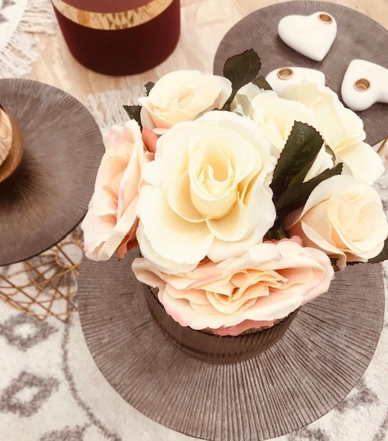 - Para las partes de objetos más pesados, se puede añadir una bandeja y en ella, jarrón con flores y dos velitas decorativas.