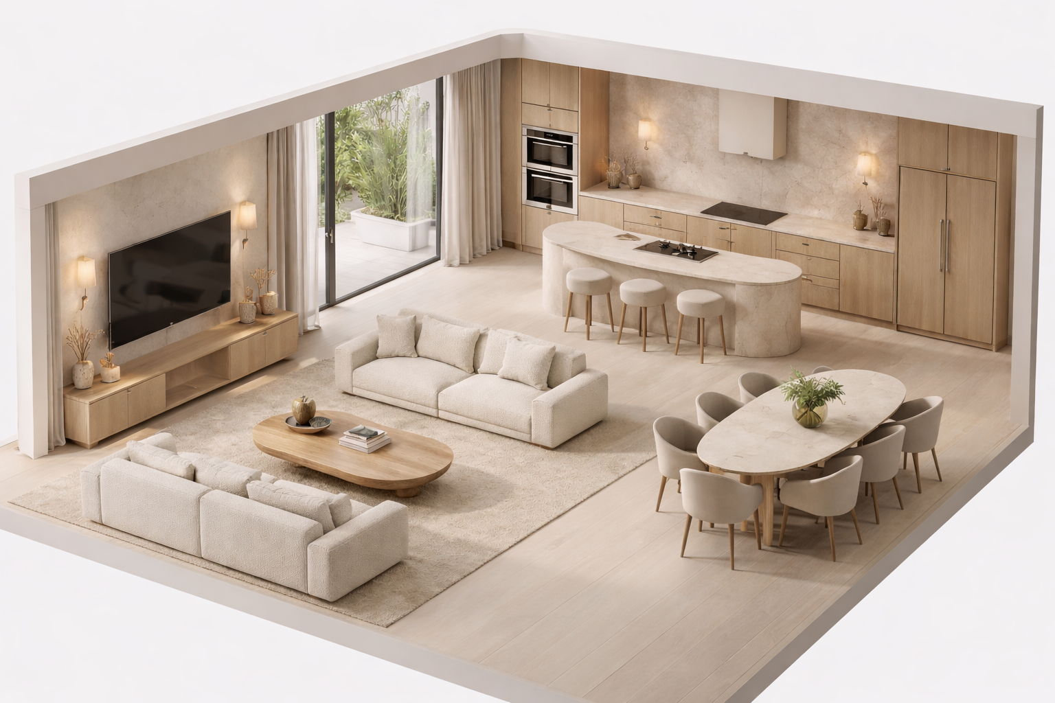Servicio completo de decoración con estudio de feng shui, pensado para diseñar una estancia que se encuentre vacía o con pocas piezas de mobiliario. Además de definir la distribución, los colores, los acabados, el mobiliario y los detalles decorativos, se tiene en cuenta la armonía energética del espacio para favorecer el equilibrio, el bienestar y la fluidez.